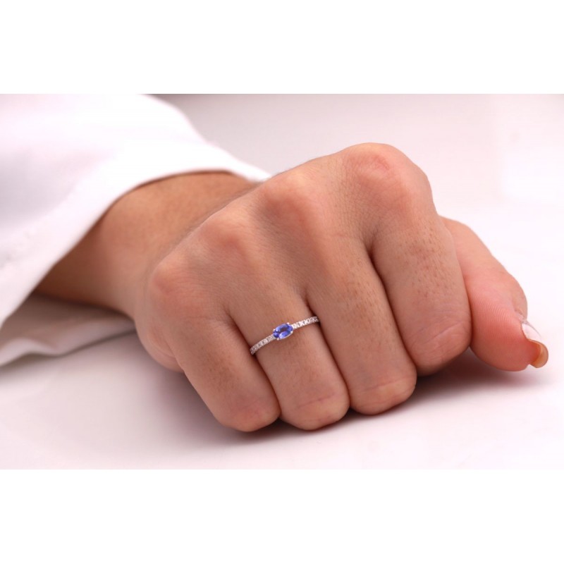 - Design: anel com aro cravejado de diamantes e tanzanita central