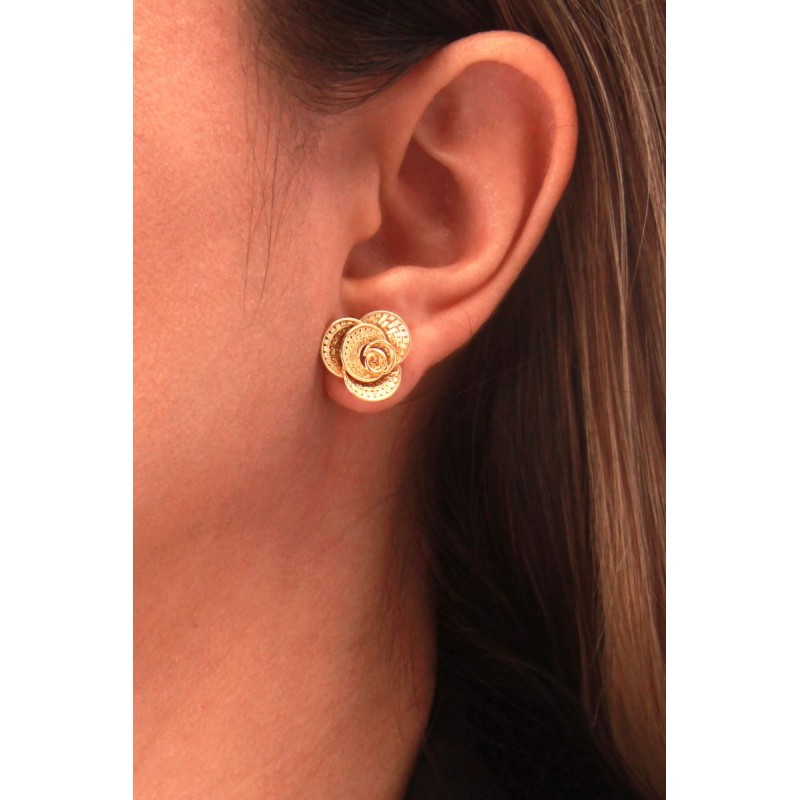 Design: brinco em formato de flor com detalhes vazados nas pétalas.